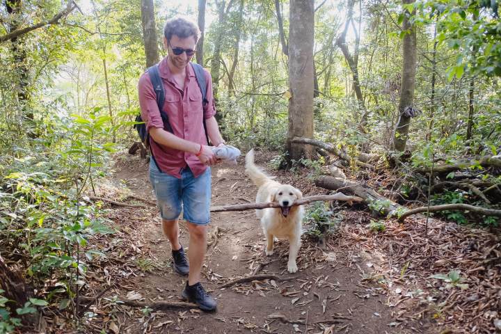 Tag 1 in Monteverde: Direkt am Haus ist ein schöner Trail, den ihr z.B. zum Sonnenuntergang laufen könnt. Dauer: ca. 1h. Wir wurden hier von den zwei Hunden des Casas begleitet, was wieder zu diesen kleinen unerwarteten Glücksmomenten auf Reisen führte.