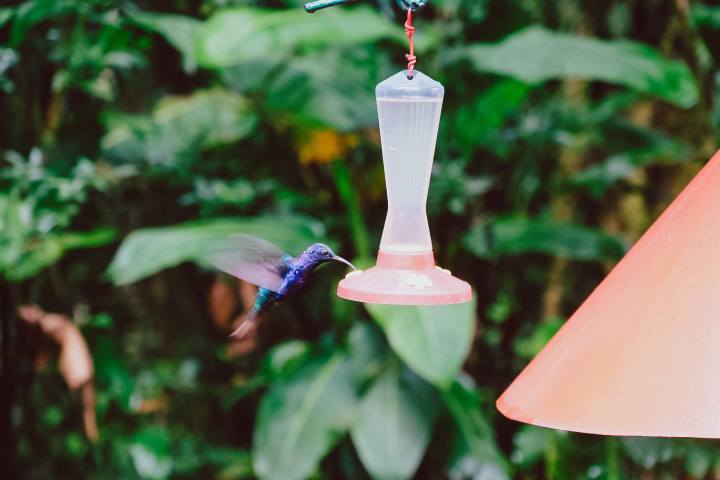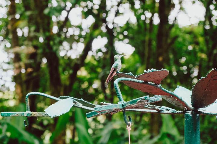 Der letzte Teil führte uns zum Kolibri-Garten. Was für eine Geräuschkulisse, die diese kleinen Wesen durch das schnelle Bewegen ihrer Flügel erzeugen. Die Tränken locken die kleinen Vögel an. Wenn ihr geduldig seid, setzen sich die Kolibris direkt auf eure Finger. Für mich war das ein weiteres Highlight unserer Costa Rica Rundreise. So hab ich mir die Flitterwochen vorgestellt – voller Glücksgefühlte. Ich bin so angetan, dass ich die Zeit komplett vergessen habe…